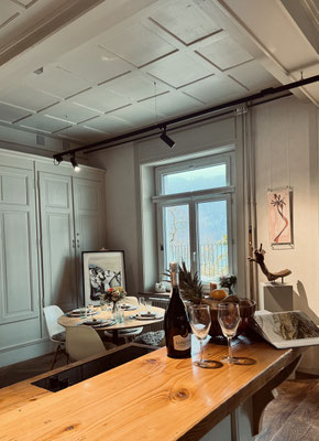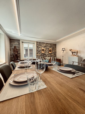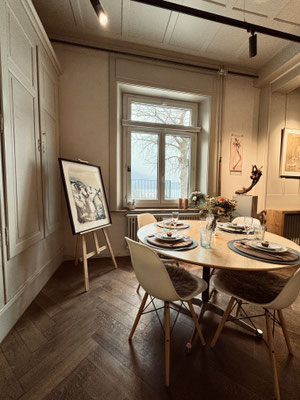 Die Unterkunft in Brienz bietet Platz für sechs Personen und besticht durch ihre traumhafte Lage direkt am idyllischen Brienzer See mit direktem Blick auf Berge und Wasser. Der großzügige Aufenthaltsbereich lädt zum Verweilen ein, während der Balkon mit direkter Sicht auf den See einen perfekten Rückzugsort für entspannte Stunden im Freien bietet. Die Räume sind mit Kunstwerken des bekannten Holzbildhauers Beat Stähli ausgestellt, was der Unterkunft eine besondere, harmonische Atmosphäre verleiht. Ein idealer Ort für Erholung und Kunstgenuss in stilvollem Ambiente.